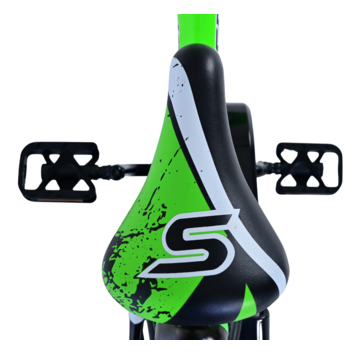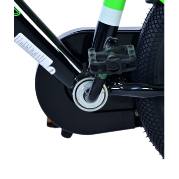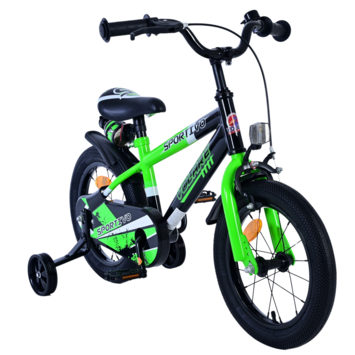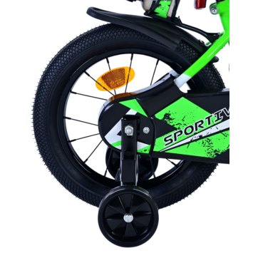 De Volare Sportivo 14 inch kinderfiets in groen en zwart is de perfecte fiets voor jonge fietsers. Veiligheid is gegarandeerd dankzij de handrem, terugtraprem en een gesloten kettingkast die de vingers van je kind beschermt. De afneembare zijwieltjes helpen je kind snel en veilig leren fietsen, zodat ze met vertrouwen op avontuur kunnen.