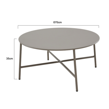Deze bijzettafel Chris in taupe metaal gebruik je als lage, stabiele tafel naast je zitplek in de tuin, op het terras of balkon. Het ronde blad met een diameter van 70 cm biedt genoeg ruimte voor glazen, borden of accessoires, terwijl de hoogte tot onderkant tafel van 34 cm goed aansluit bij loungemeubelen. Het tafelblad is 0,6 cm dik en gecoat, wat zorgt voor een gelijkmatig oppervlak dat prettig aanvoelt in gebruik. Je zet de tafel neer waar hij nodig is en verplaatst hem makkelijk bij een andere indeling. De tafel wordt als bouwpakket geleverd, zodat hij compact kan worden aangeleverd en ter plekke gemonteerd. Zo richt je je buitenruimte doelgericht in met een tafel die logisch werkt in dagelijks gebruik. Je vindt deze bijzettafel Chris bij GAMMA als praktische aanvulling voor je buitenopstelling.