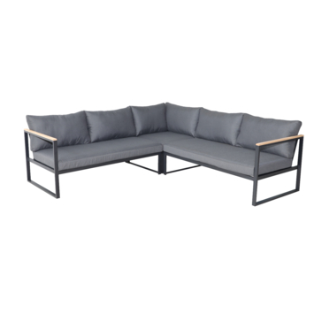 Het zwarte metalen frame van de set is niet alleen lichtgewicht, maar ook roestbestendig, terwijl de hardhouten leuningen een natuurlijke en verfijnde uitstraling aan de set geven. Dankzij deze robuuste materialen kun je jarenlang genieten van de loungeset zonder je zorgen te maken over roest of slijtage. De combinatie van het stevige frame en de grijze kussens zorgt ervoor dat de set in vrijwel elke tuin of op elk terras past.
