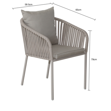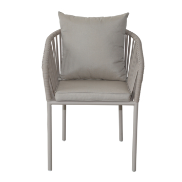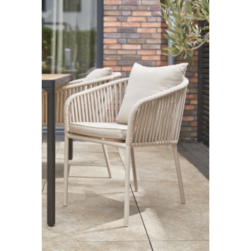 De zitting is gemaakt van beige textileen op een beige gecoat metalen frame, wat zorgt voor een stevige en moderne uitstraling. De meegeleverde beige polyester zit- en rugkussens bieden extra comfort en ondersteuning, waardoor je heerlijk kunt ontspannen.