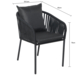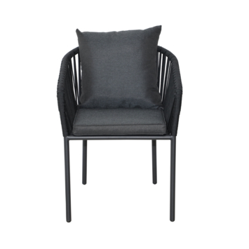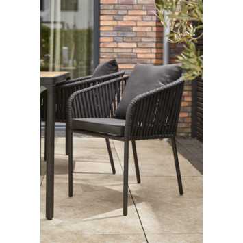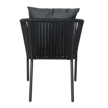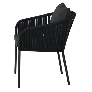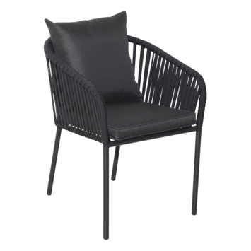 De zitting is gemaakt van zwart textileen, wat zorgt voor een stevige en ademende zit, terwijl het zwart gecoate metalen frame de stoel een moderne en tijdloze uitstraling geeft. De meegeleverde zwarte polyester zit- en rugkussens zorgen voor extra comfort en maken de stoel compleet.