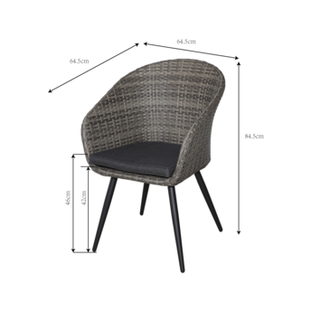 De Wakefield tuinstoel Modena in grijs is een perfecte keuze voor wie op zoek is naar een stijlvolle en comfortabele stoel voor zijn buitenruimte. Met een zithoogte van 45 cm en de royale afmetingen van 64,5 cm breed en 64,5 cm diep, biedt de stoel voldoende ruimte voor een ontspannen zitervaring. Het stevige metalen frame zorgt voor stabiliteit en gaat lang mee, terwijl de grijze kussens extra comfort bieden, zodat je heerlijk kunt zitten.