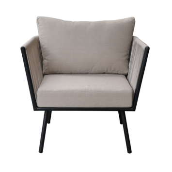 De zitting is gemaakt van beige textileen, wat zorgt voor een stevige en ademende zitervaring, terwijl het zwart gecoate metalen onderstel de stoel een moderne en tijdloze uitstraling geeft. De meegeleverde beige polyester zit- en rugkussens zorgen voor extra comfort en maken de stoel compleet.