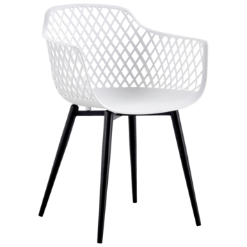 De zitting is vervaardigd uit wit kunststof, wat zorgt voor een moderne en frisse uitstraling, terwijl het zwart kunststof onderstel de stoel een stevig en strak karakter geeft. Het kunststof materiaal is weerbestendig en onderhoudsvriendelijk, waardoor de stoel perfect geschikt is voor langdurig buitengebruik.