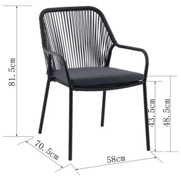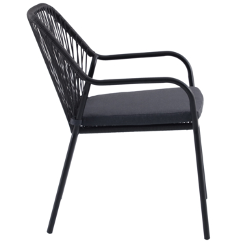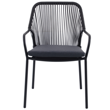 De zitting van zwart wicker en het zwart gecoate metalen frame zorgen voor een stevige en stijlvolle uitstraling die moeiteloos past in verschillende buitenomgevingen. Voor extra comfort wordt de stoel geleverd met een bijpassend zwart zitkussen, zodat je direct kunt genieten van een zachte en aangename zitervaring.