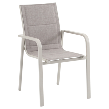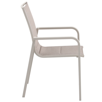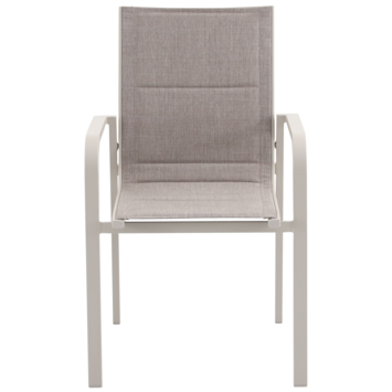 De Wakefield tuinstoel Valencia in beige is de perfecte keuze voor wie op zoek is naar een moderne en comfortabele zitplek in de tuin of op het terras. De zitting is gemaakt van beige textiel, wat zorgt voor een lichte, elegante uitstraling, terwijl het beige metalen onderstel een stevige basis biedt en eenvoudig te combineren is met verschillende tuinmeubels.