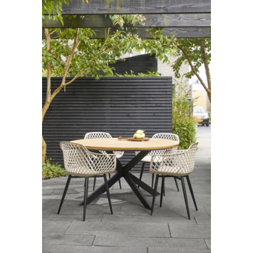 De tuintafel Palma van Wakefield biedt de ideale combinatie van functionaliteit en stijl. Met een rond tafelblad van 140 cm biedt deze tafel ruimte voor zes personen, perfect voor gezellige diners, borrels of ontspannen momenten in de buitenlucht. Het blad is vervaardigd uit hoogwaardig eucalyptus hout, wat zorgt voor een warme en natuurlijke uitstraling. Het zwart metalen onderstel voegt een moderne en robuuste touch toe en zorgt voor extra stabiliteit. Dankzij deze combinatie van materialen past de Palma moeiteloos bij verschillende tuin- en terrasstijlen. Met een hoogte van 76 cm biedt de tafel een comfortabele zithoogte en voldoende ruimte om met meerdere personen aangenaam te tafelen. De Palma wordt geleverd als bouwpakket en is eenvoudig te monteren. Deze tafel is niet uitschuifbaar, maar biedt ruim voldoende plek voor zes personen, waardoor het een praktische en stijlvolle keuze is voor elke buitenruimte. Kies voor de Wakefield tuintafel Palma en geniet van een tijdloos ontwerp dat jouw tuin of terras compleet maakt.