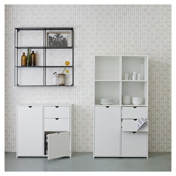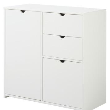 Deze opbergkast Nantes is een moderne kast en is exclusief voor Gamma geproduceerd. De kast is gemaakt van wit gelakt, FSC gecertificeerd, grenenhout met de afmetingen 77x80x35. Het interieur is gemaakt van melamine. De kast bestaat uit 2 afgesloten opbergvakken met deur, links een grote met daarin 1 legplank en rechts een kleinere. Boven de rechterzijde bevinden zich 2 lades met metalen geleiderails.