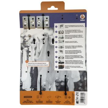 Set met waskoord en de nodige bevestigingselementen, inclusief installatie stappenplan met foto's. Sterke waskoord of waslijn met staalkabel kern en plastiekomhulsel. Doorzakken door warmte of hoge belasting wordt vermeden. Door het gebruik van de draadspanner kan je de wasdraad eenvoudig en snel op spanning brengen en houden. Door de verbindingshaken is de wasdraad ook gemakkelijk terug weg te nemen, bvb. in de winter of bij een tuinfeest.
