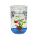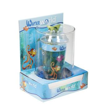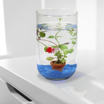 Leuke aankleding voor de kinderkamer. Deze decoratieve aankleding voor op bijvoorbeeld een bureau of vensterbank. In de vaas bevindt zich een waterplantje en een vrolijk uitziend kunststof visje. De bodem van het vaasje is bedekt door blauw grind.