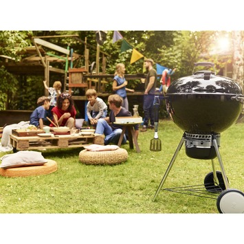 Je zoekt de meest veelzijdige en luxe houtskoolbarbecue van Weber? Dan moet je de Weber barbecue Master-Touch Premium grey GBS 57 cm hebben. Deze houtskoolbarbecue heeft een diameter van 57cm en is uitgerust met het zogenoemde Gourmet BBQ-systeem. Dit is een tweedelig rooster, waarvan je de binnenste ring kunt vervangen voor een van de 8 los te verkrijgen accessoires, zoals een poffertjespan of pizzasteen. Het rooster is drievoudig verchroomd en de buitenkant is van geëmailleerd staal, wat allebei roest zoveel mogelijk tegengaat. De deksel is voorzien van een aluminium ventilatierooster, waarmee je zorgt voor de juiste luchttoevoer voor het perfecte stuk vlees. Daarnaast kun je de deksel met de zogenoemde Tuck-Away dekselhouder makkelijk vastzetten, en werkt de deksel tegelijkertijd als een 'windscherm', zodat je jouw vlees, vis en groenten ook kunt braden als de wind oprukt. Dankzij de scheurvaste wielen kun je de barbecue eenvoudig verplaatsen van de ene naar de andere kant van je tuin. Bovendien is de glasvezelversterkte handgreep voorzien van een hitteschild, zodat je jouw handen niet verbrand wanneer je de deksel optilt. De barbecue wordt geleverd in losse delen, die je met de uitgebreide gebruiksaanwijzing eenvoudig zelf in elkaar kunt zetten. Kortom: de klassieke alleskunner van Weber.