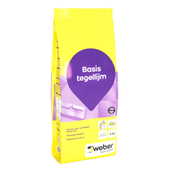Weber basis tegellijm grijs 4kg is de ideale grijze tegellijm voor op wanden en vloeren. De Weber Basis tegellijm is verpakt in een handige kunststof (PE) verpakking en heeft een inhoud van 4kg. Deze tegellijm is te gebruiken op beton en zandcement en daarnaast ook voor tegel over tegel verlijming. De tegellijm voldoet aan een hoge standaard en is een ideale tegellijm bij renovatieprojecten waarbij tegels over tegels worden gelijmd. Kortom: de perfecte basis tegellijm voor tegels tot 35x35 cm.