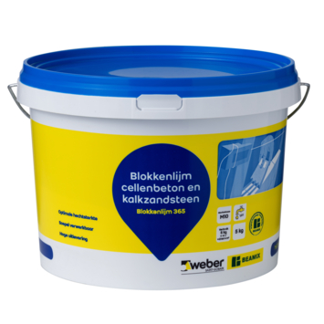 Weber Beamix Beamix Blokkenlijm 365 voor het lijmen van cellenbeton en kalkzandstenen. Weber Beamix Beamix Blokkenlijm 365 is een fabrieksmatig vervaardigde droge mortel, op basis van NEN-EN 998-2: 2010. Prestatie lijmmortel in de sterkteklasse M10 en morteltype T. De blokkenlijm heeft een optimale hechtsterkte.