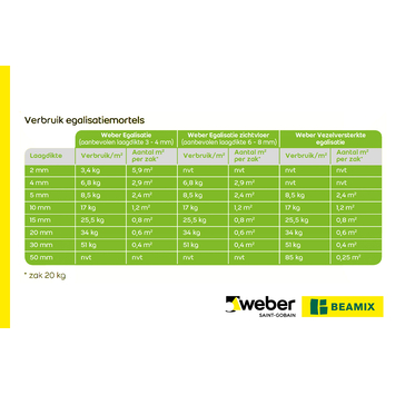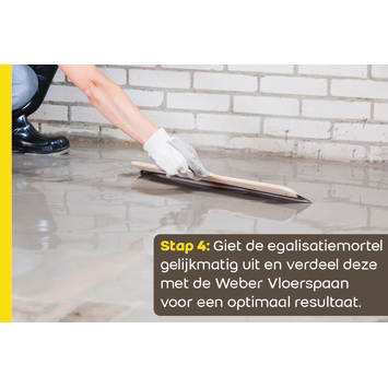 Met Weber Beamix Vezelversterkte Egalisatie 20 kg geef je slechte ondergronden snel en eenvoudig een stevige, vlakke basis. Dit product is perfect voor houten (verdiepings)vloeren en is zelfnivellerend, geschikt voor laagdiktes van 5 tot 50 mm. Het is stofarm en kan zelfs over vloerverwarming worden toegepast. Het product is makkelijk aan te brengen, en met een verbruik van 1,7 kg per m² is het zeer efficiënt. Weber Beamix Vezelversterkte Egalisatie is echter niet geschikt als eindafwerklaag, maar biedt wel de ideale ondergrond voor je vloerafwerking.