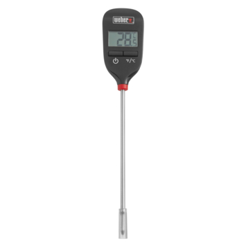 Het allerbelangrijkste voor de bereiding van het perfecte stuk gegrild vlees? Dat is de kerntemperatuur. Deze is heel eenvoudig te meten met de Weber digitale thermometer. Op deze praktische thermometer lees je de temperatuur in Celcius of Fahrenheit snel en nauwkeurig af, zodat je niet in je vlees hoeft te snijden om te controleren of deze al gaar is. De thermometer is voorzien van een scherpe pen, die je met gemak door het vlees steekt. De meter is gemaakt van kunststof en eenvoudig schoon te maken met een natte doek. Kortom: met deze digitale thermometer zorg je voor perfect gegaard vlees.