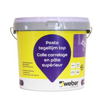 Weber pasta tegellijm top wit 4g is geschikt voor het lijmen van vele soorten keramische wandtegels en mozaïek op vrijwel alle soorten ondergronden. Deze pasta tegellijm van Weber is voor gebruik binnenshuis en ook te gebruiken in vochtige ruimtes zoals de badkamer. De kant-en-klare tegellijm lijmt ook tegel over tegel maar ook direct op cement, beton, gipsplaten, gipsvezelplaten, pleisterlagen en kalkzandsteen. De kant-en-klare pasta lijm wordt geleverd in een handige emmer en heeft een inhoud van 16kg. De tegellijm is geschikt voor het plakken van wandtegels met een maximale afmeting van 35x35 cm.