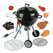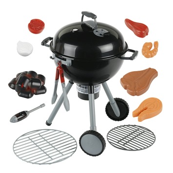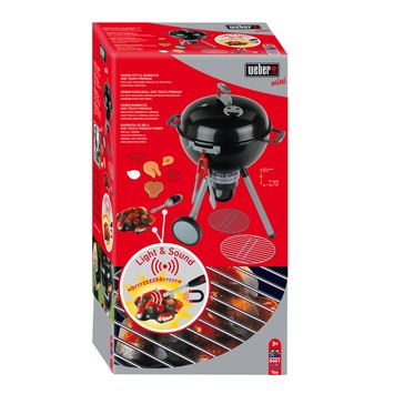 Weber mini kogel barbecue One-Touch Premium met licht en geluid. Origineel lijkend speelgoed met kindgerichte functies. Inclusief: zalmsteak, paprika, tomaat, ui, T-bone steak, kolenstapel met electrische functie, aansteker, barbecuerooster, kolenrooster, barbecuetang. Exclusief batterijen 3xAAA/R03. Adviesleeftijd: vanaf 3 jaar.