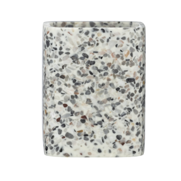 De Terrazzo tandenborstelbeker creëert met zijn patroon in wit, beige en grijze accenten een trendy en decoratieve sfeer aan jouw badkamer. De Terrazzo badkamercollectie is gemaakt van Polyresin; een mix van gemalen natuursteen wat wordt vermengd met een vloeibare kunsthars. De tandenborstelbeker is daardoor zo hard als steen, vochtbestendig en kleurecht. Dit maakt het gebruik ervan in de badkamer ideaal. De Terrazzo serie heeft meer accessoires voor jouw badkamer en toilet in een terrazzo tegellook.