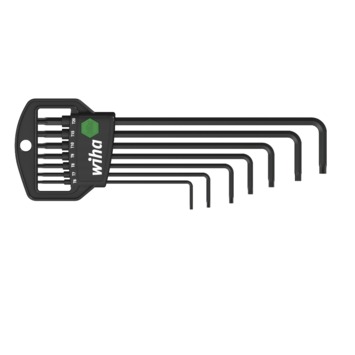 Een stiftsleutel wordt ook wel inbussleutel genoemd en gebruik je voor het los- of vastdraaien van schroeven. Deze stiftsleutelset in classic houder van Wiha bestaat uit zeven verschillende stiftsleutels met torxkop, waarmee je eenvoudig bij moeilijk bereikbare torxschroeven tot een hoek van 25° komt. Dit gereedschap is gemaakt van zwart chroom-vanadiumstaal en daarom enorm sterk en corrosiebestendig. Met de makkelijke houder raak je de inbussleutels niet snel kwijt en bespaart het je opbergruimte. Kortom: een fijne set met torx-stiftsleutels.