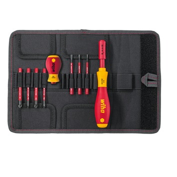 Een schroevendraaier- en bitset in één, dat is de schroevendraaier en bitset slimVario® van Wiha. Deze negendelige set bestaat uit twee verschillende schroevendraaiers met bithouder plus zes bitjes (3 x sleufkop, 2 x Philipskop en 2 x Pozidriv) in verschillende maten. De set wordt geleverd in een handige opbergetui en is daarom ruimtebesparend. Het gereedschap is bedoeld voor kluswerkzaamheden aan spanningvoerende elementen tot 1.000 Volt AC. Kortom: een sterke en geordende set.