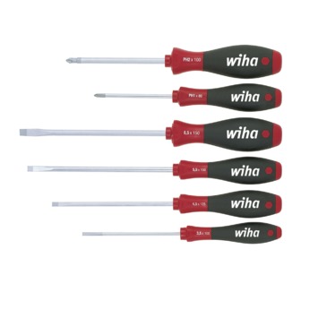 Een handige set met de meest gangbare schroevendraaiers voor droge toepassingen, dat is de schroevendraaierset SoftFinish van Wiha. Deze zesdelige set bestaat uit twee schroevendraaiers met een Philipskop (kruiskopvorm) en vier met sleufkop van diverse afmetingen, erg handig voor droge en algemene kluswerkzaamheden. De greep bestaat uit een gepatenteerde SoftFinish, die je handen en spieren spaart. Kortom: een prettige set voor in je kluskoffer.