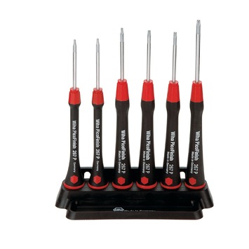 Een handige set met torx-fijnschroevendraaiers in diverse maten, dat is de fijnschroevendraaierset PicoFinish van Wiha. Deze zesdelige set bestaat uit zes fijnschroevendraaiers met een torx-kop van diverse afmetingen, erg handig voor fijne en gedetailleerde schroefwerkzaamheden. Bijvoorbeeld voor het openen van mobiele telefoons of elektronische apparatuur. De slanke PicoFinish-finish handgreep met draaibare kap zorgt voor een goede grip. Kortom: een prettige set voor in je kluskoffer.