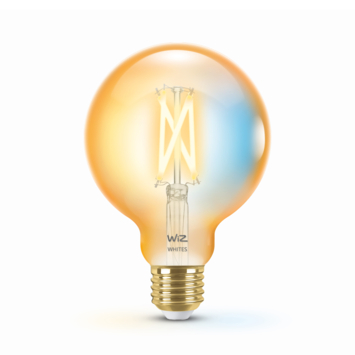 Breng gemakkelijke, slimme verlichting in huis. Deze goudkleurige, bolvormige WiZ LED-filamentlamp geeft zowel warm- als koelwit licht, dat je helpt ontspannen of juist concentreren. Je kunt timers instellen die je lampen automatisch in- of uitschakelen, gebaseerd op jouw dagritme. Bijvoorbeeld helder wit licht in de ochtend en zacht warm licht in de avond. Je kunt ze bedienen met je smartphone of stem, zelfs als je niet thuis bent. WiZ lampen werken rechtstreeks vanuit de doos, op je eigen wifinetwerk. Deze lamp heeft een E27-fitting, en past dus in de meeste lampen met grote fitting.