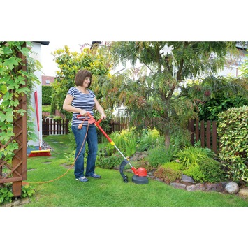 De Wolf-Garten elektrische grastrimmer BluePower GTE 850 is een milieubewuste grastrimmer. De trimmer is uitgerust met een blauwe knop, wanneer je deze indrukt bespaard de motor stroom door het vermogen te verminderen. De machine heeft een maximaal vermogen van 500 watt. De dubbele draad wordt automatisch verlengt. De grastrimmer heeft een maaibreedte van 27 cm. Dankzij de wieltjes is de Wolf-Garten elektrische grastrimmer BluePower GTE 850 makkelijk en comfortabel in gebruik.