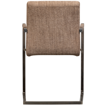 De geweven stof voelt aangenaam aan en het metalen onderstel houdt het ontwerp stevig en slank. De zithoogte van 49 en de zitdiepte van 44 maken de stoel geschikt voor lange gesprekken of een avond uitgebreid tafelen.