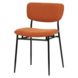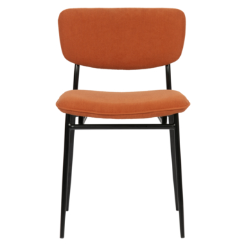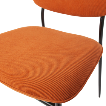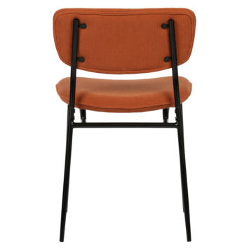 De stoel is bekleed met ribfluweel (100% polyester) in een warme roestbruine tint. Deze stof voelt zacht aan en heeft een Martindale van 25.000, wat betekent dat hij geschikt is voor intensief gebruik. Het onderstel van zwart gepoedercoat staal zorgt voor stabiliteit en een eigentijdse afwerking.