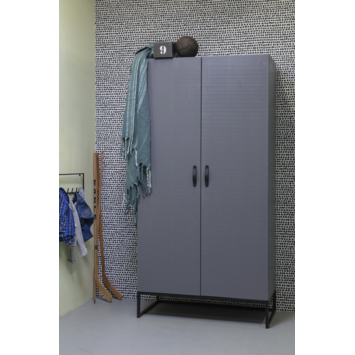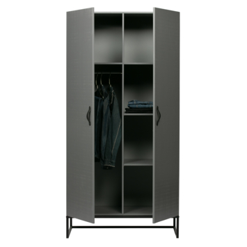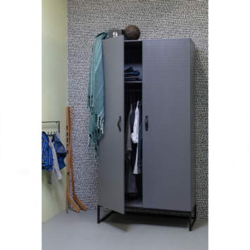De WOOOD kledingkast 2-deurs Morris 2 leemgrijs grenenhout 195 x 100 x 53 cm combineert een robuuste uitstraling met praktische indeling. De stoere leemgrijze kleur, zwarte leren handgrepen en het zwarte frame maken de kast een stijlvolle toevoeging aan de slaapkamer of kinderkamer. Met zijn royale afmetingen biedt de Morris volop ruimte voor het overzichtelijk opbergen van kleding.