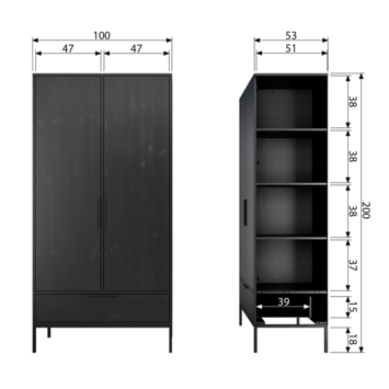 WOOOD kledingkast Adam 2 deurs zwart 200x100x53 cm479.00