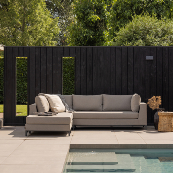 De hoek bevindt zich aan de linkerzijde, wat zorgt voor een ruimtelijke en uitnodigende indeling. De diepe zitting en lage armleuningen maken de bank extra comfortabel. Om de bank goed te onderhouden, wordt aanbevolen om de kussens op te bergen bij slecht weer en de set af te dekken tijdens de winterperiode.