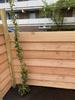 Installeer tuinpalen van minimaal 240 cm lengte elke 50 cm uit elkaar. Bij losse ondergrond gebruik je snelcement, beschikbaar bij GAMMA. Bevestig het onderste rabatdeel met de dikkere kant naar beneden tegen de palen, en gebruik twee schroeven van 50 mm per paal, 4 cm van de boven- en onderkant van de plank. Zorg ervoor dat de schroeven niet volledig tegen de randen geschroefd zijn om ruimte te laten voor het werken van het hout. Controleer met een waterpas en voeg de volgende rabatdelen toe, werk omhoog tot de gewenste hoogte is bereikt.
