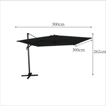 Deze parasol heeft een hoogte van 262 centimeter, een breedte van 300 centimeter en een lengte van 300 centimeter. De diameter van de paal is 7,7 centimeter.