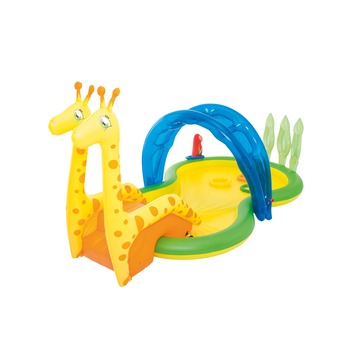 Het Bestway Zwembad Giraffe Waterpark is gemaakt van vinyl waardoor hij zeer stevig is en niet snel kapot gaat. Inclusief Kap, Waterspuit, veiligheidsklep, glijbaan en een reparatiesetje. Het waterpark is 167 cm breed, 129 cm hoog en 338 cm lang en weegt in totaal 5,2 kg. Dit product is geschikt voor kinderen vanaf 2 jaar.