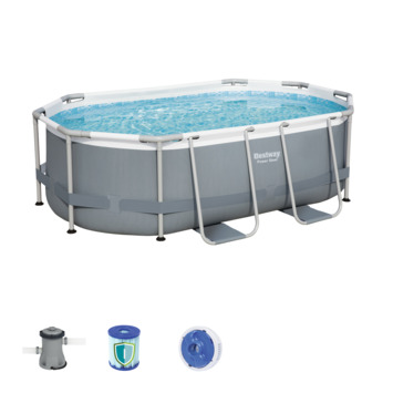 Het unieke ovale ontwerp en de vorm maken dit zwembad compacter, dus het heeft minder ruimte nodig om op te zetten en minder water om het te vullen. Het zwembad is uitgerust met een Seal & Lock System ™ voor een veilige en beveiligde buisverbinding. Het antimicrobiële filterpatroon verlengt de levensduur en kwaliteitsfiltering en voorkomt dat algen, schimmels en andere microbiële bacteriën in uw zwembad groeien. Het zwembad wordt geleverd inclusief fiilterpomp en reparatiepleister.