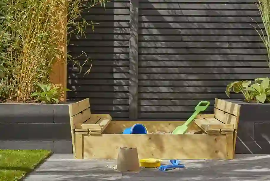 In deze tuin hebben de kinderen alle ruimte voor vrij spel, om te rennen of met hun fietsen of stepjes rond te rijden. De allerkleinsten vermaken zich in een kleine zandbak met opklapbare zitjes. Zodra de kinderen wat groter groeien, transformeer je deze plek eenvoudig naar een kruidenbak of plantenbak.