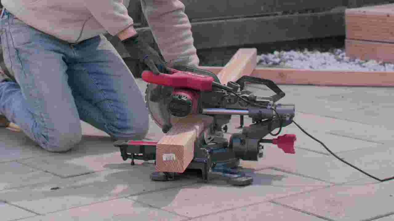 We beginnen met het op maat zagen van al het benodigde hout. Voor dit fietsenhok hoef je geen gebruik te maken van ingewikkelde houtverbindingen. Je kunt het hout zagen met een handzaag, maar het snelst gaat dit met een cirkelzaag of afkortzaag. Als je die niet hebt, kun je er een huren bij GAMMA.