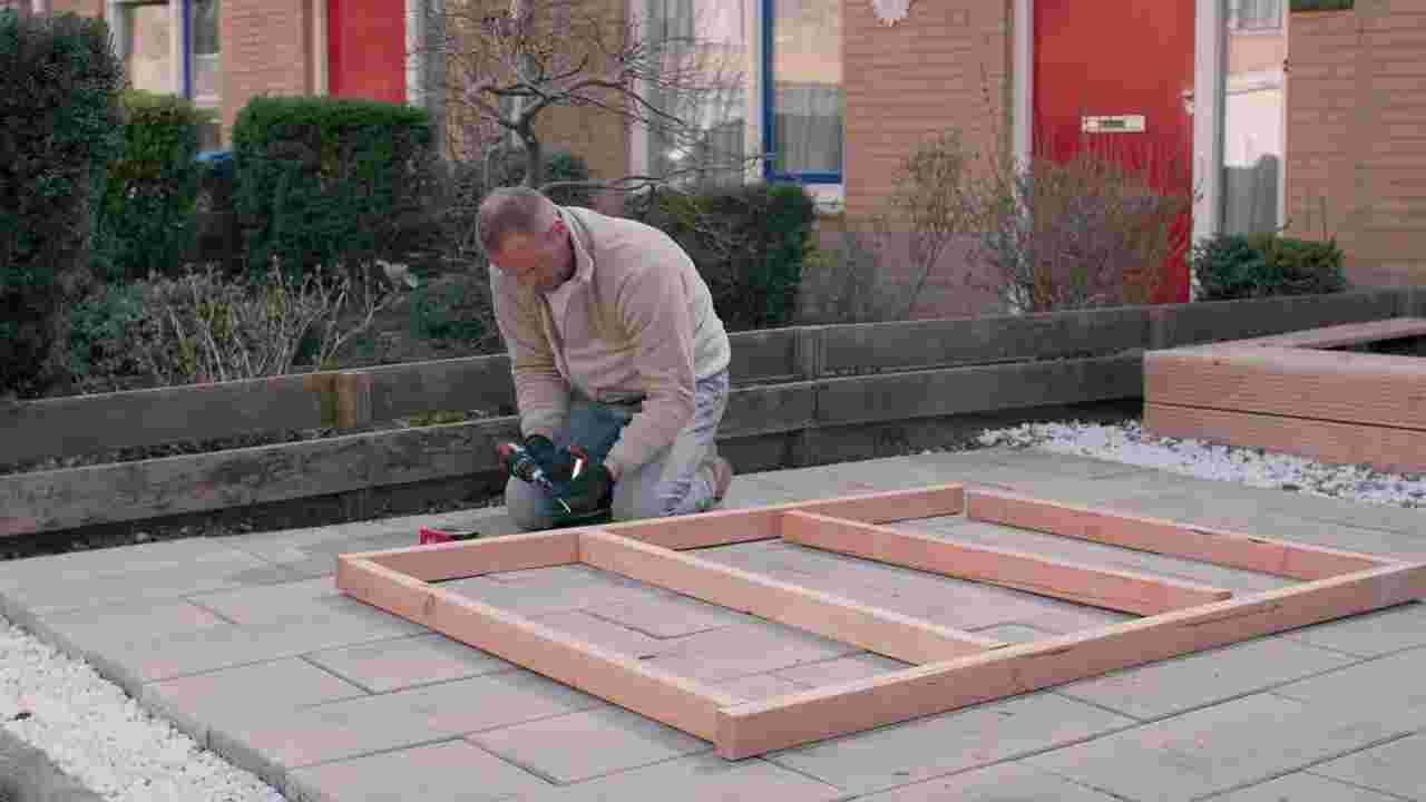 Wanneer alle onderdelen op maat zijn gezaagd, starten we met het monteren van de frames. Zorg dat de afstanden tussen de balken gelijk zijn. Gebruik hiervoor 5x80 mm schroeven en zorg ervoor dat je altijd voorboort om scheuren in het hout te voorkomen.