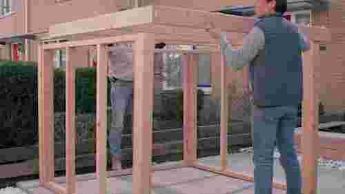 Als het geheel stabiel staat, schroef je het dakframe vast aan de frames. Dit doe je door een hem via de onderzijde van het zijframe vast te schroeven. Zorg ervoor dat het dakframe goed is uitgelijnd met de rest van de constructie.