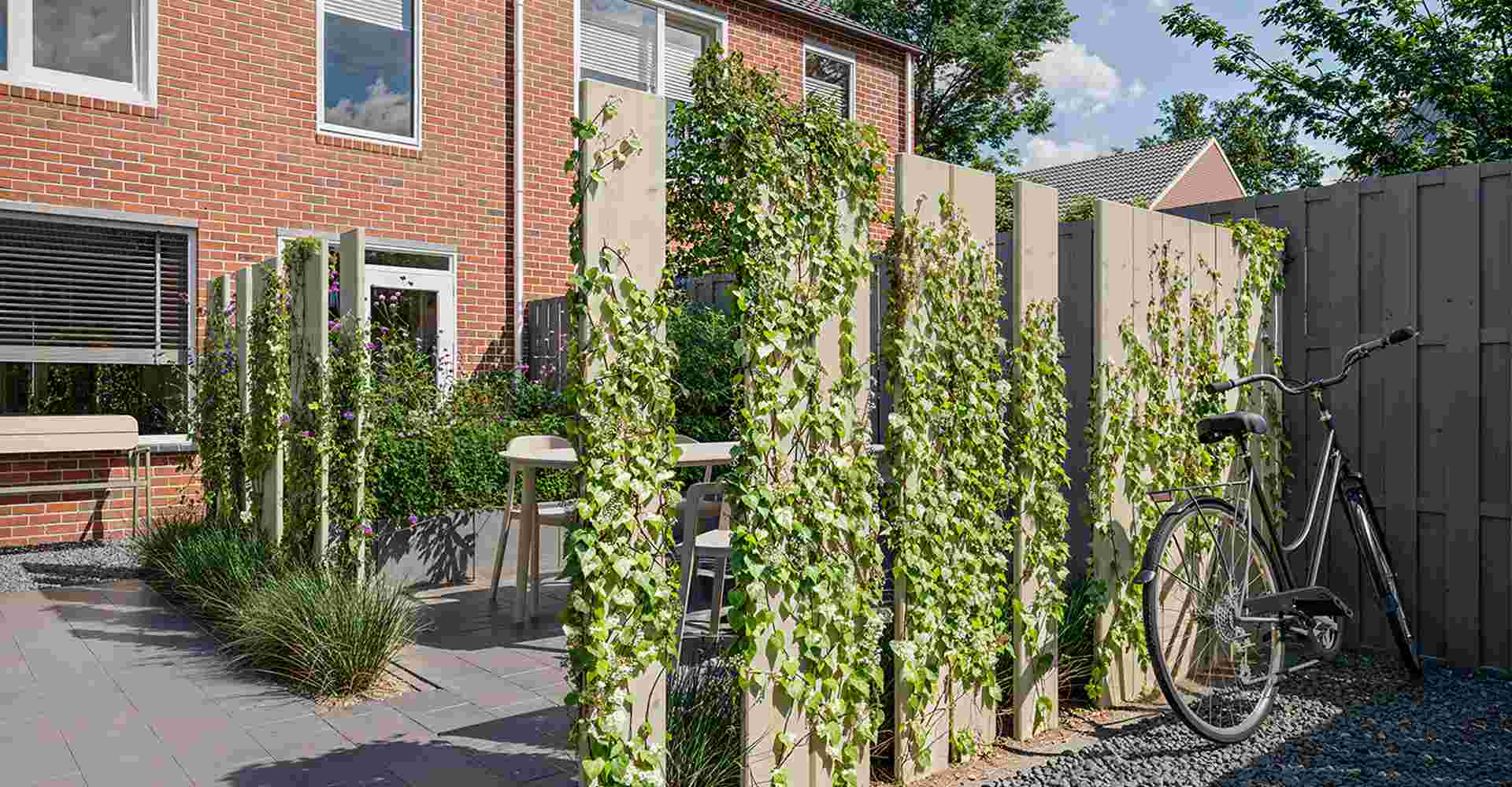 TIP! Laat wat klimplanten tegen de latten omhoog slingeren voor een nóg groenere uitstraling.