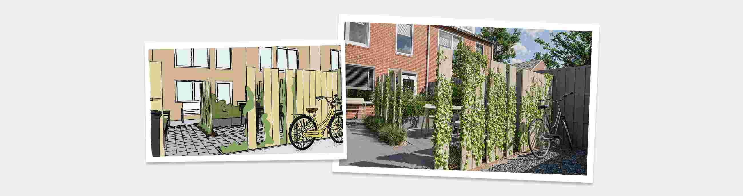In de lage borders zorgen verticaal geplaatste planken voor nog meer privacy. Achterin zorgen repeterende planken ervoor dat de fietsen uit het zicht staan. Plaats de planken niet dicht tegen elkaar, maar laat ertussen wat ruimte open. Zo blijf je de lengte van de tuin overzien, wat bij een kleine tuin belangrijk is voor een optisch vergrotend effect.