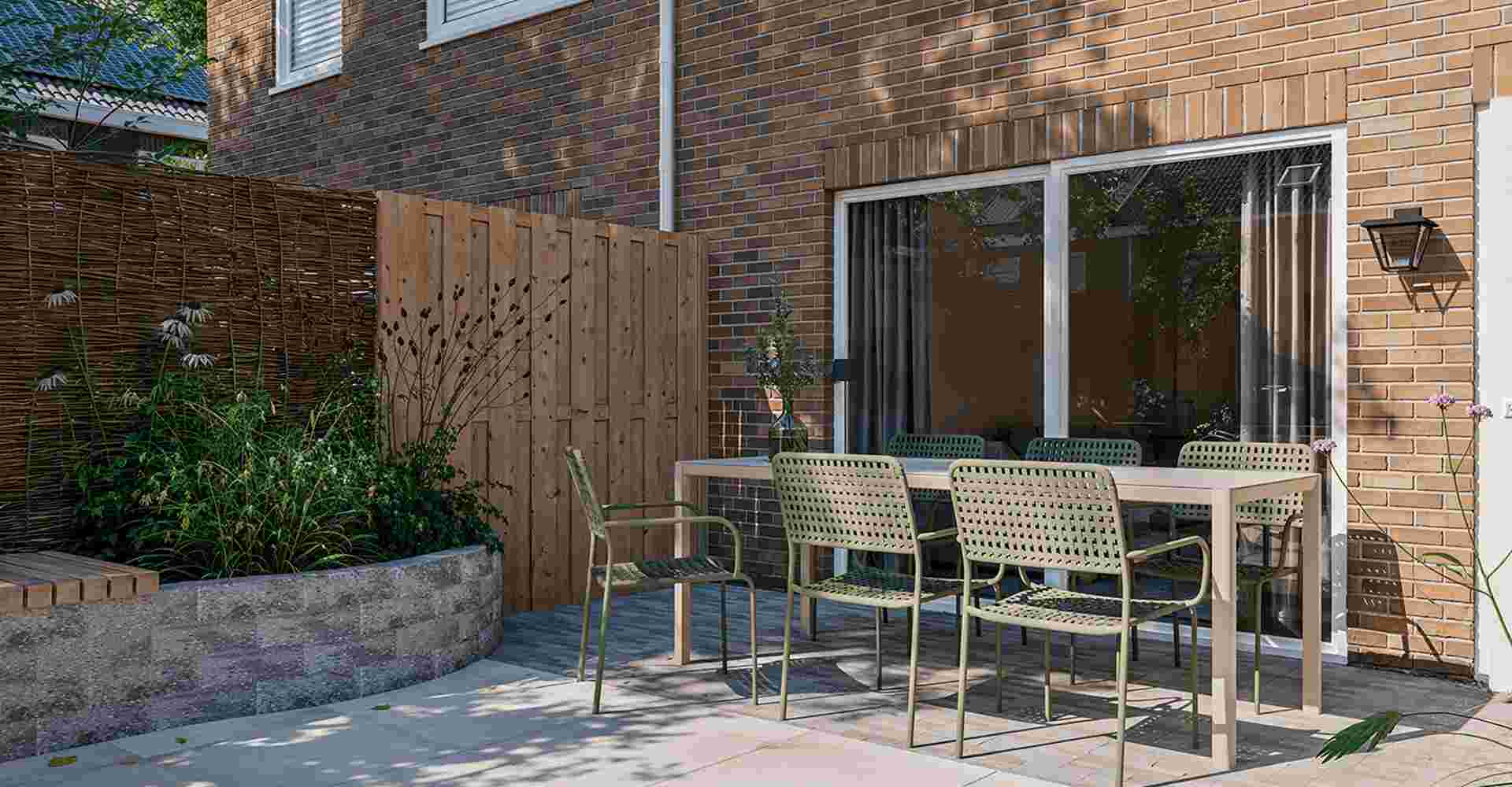 De borders die de terrassen links en rechts omsluiten, zijn organisch van vorm en verschillen in hoogte van elkaar. Dit zorgt voor dynamiek, maar pas op: maak de borders in een kleine tuin niet té hoog, anders heb je de kans dat je tegen de zijkant aankijkt, in plaats van naar de planten. Maak de border minstens 60 centimeter diep, zo kun je twee lagen beplanting achter elkaar kwijt. Een afboording van het ecologische Ecolat is ideaal voor het vormen van een organische border.