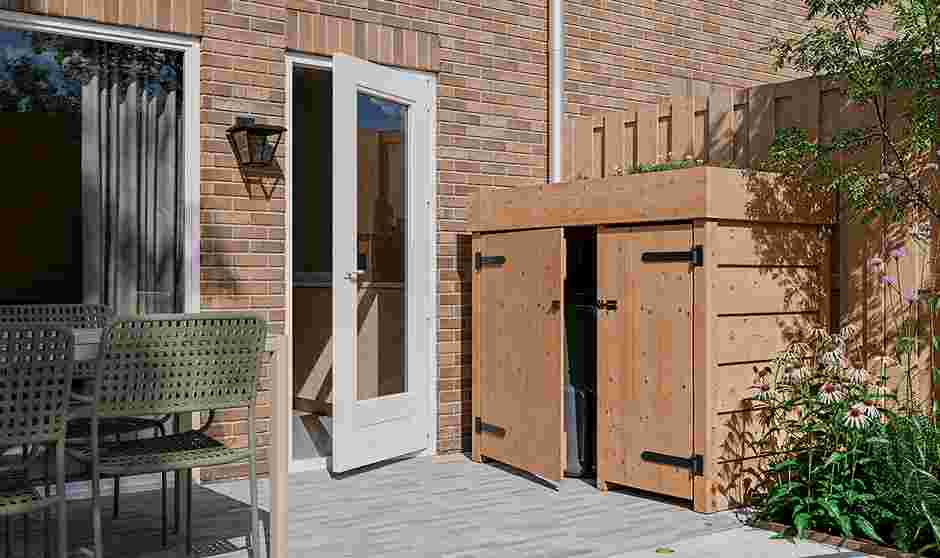 Wil jij je afval zo goed mogelijk scheiden, maar heb je hier weinig ruimte voor? In deze fraaie recyclekast kun je al je afval duurzaam scheiden, zonder dat het potsierlijk staat op je terras. Daarnaast zorgen we in de organische borders voor veel bijenlokkende beplanting, zo draag je je steentje bij aan de biodiversiteit. Het groenafval van deze tuin verdwijnt in de compostbak, waar ook je keukenresten een tweede leven krijgen.