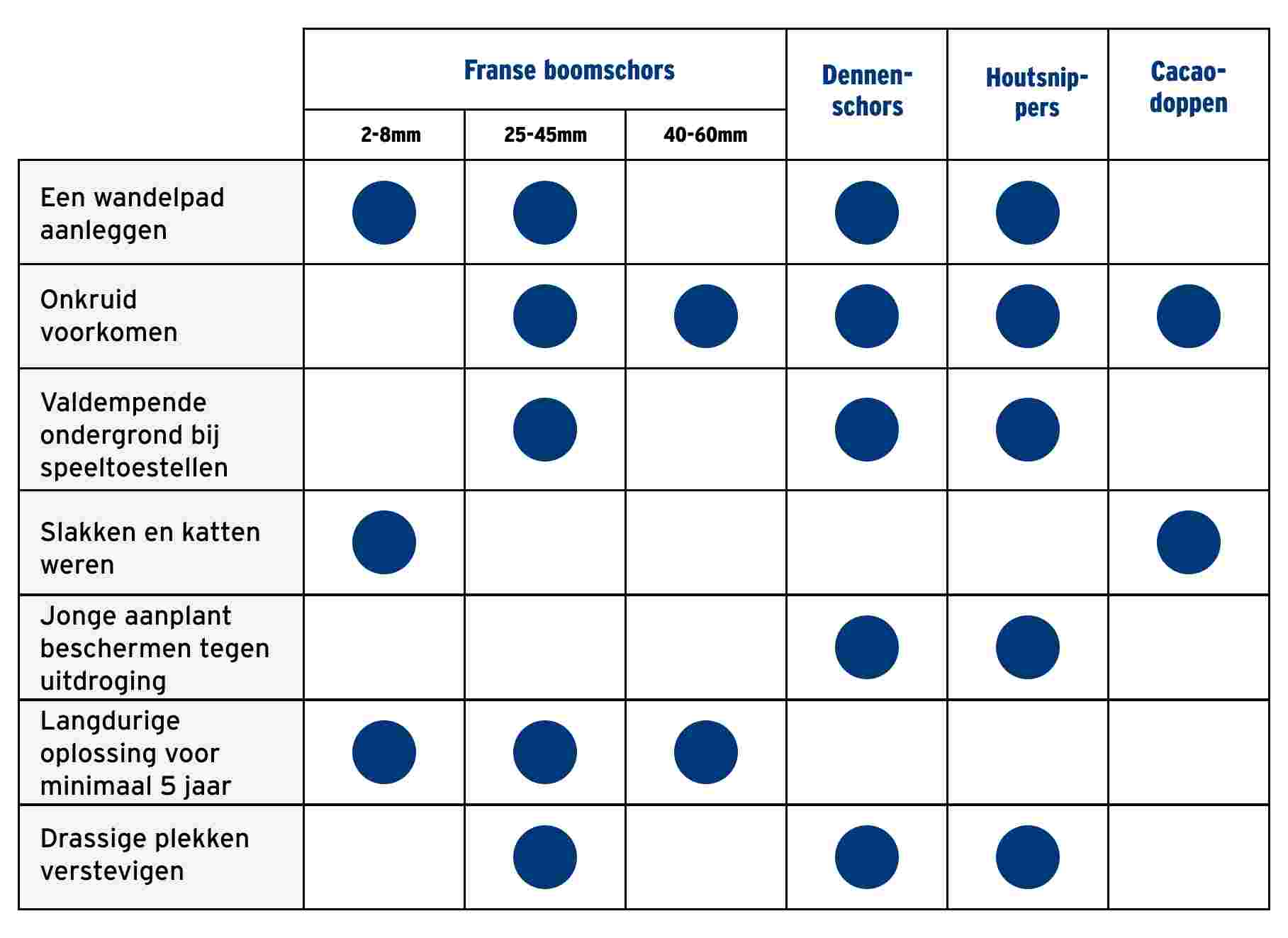 Wil jij met mulchen onkruid tegengaan? Houtsnippers en cacaodoppen zijn hiervoor zeer geschikt. Ze zijn plantaardig, dekken de bodem mooi af en hebben een onopvallende bruine kleur. Omdat ze vrij grof en hard van structuur zijn – hoe groener de mulch, des te sneller hij verdwijnt – blijven boomschors en cacaodoppen relatief lang intact en is aanvullen pas na twee jaar weer nodig.