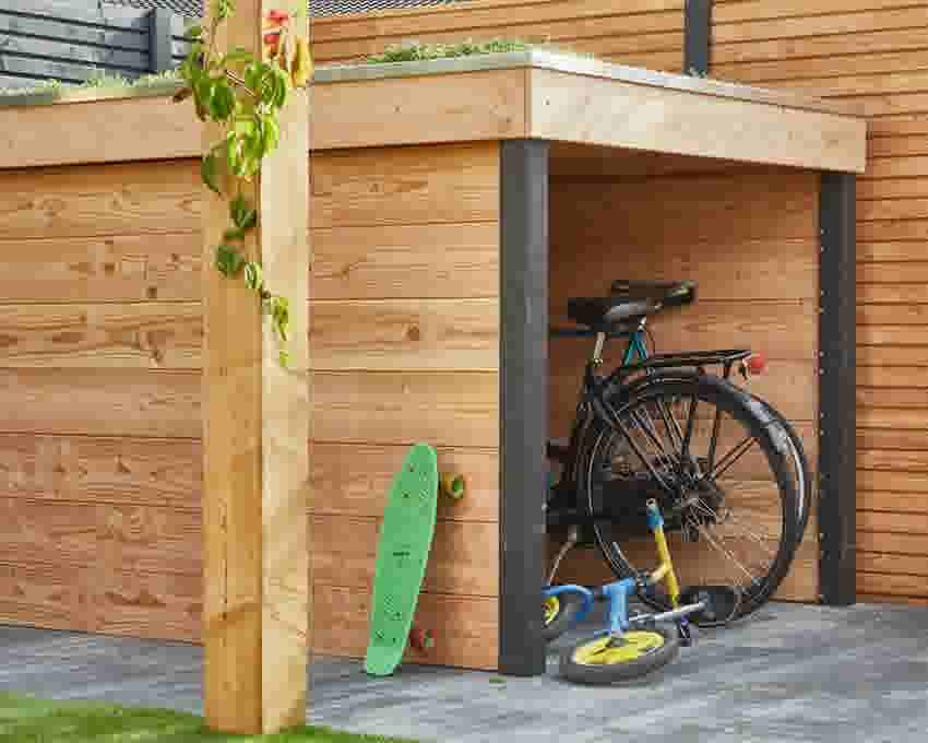 Maak een plek om je fietsen beschut en uit het zicht op te kunnen bergen. Door een combinatie van rhombus- en blokhutprofielen geef je diepte aan je tuin.